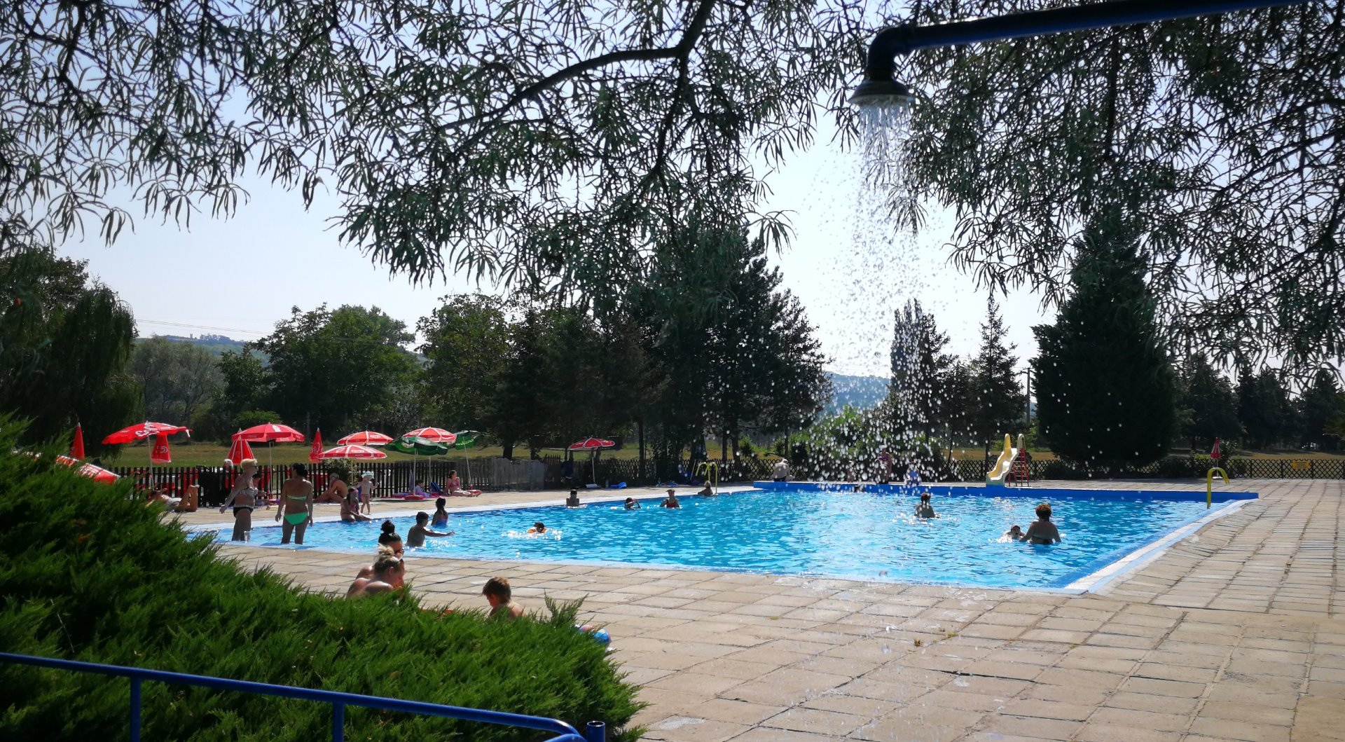 Návštěvníkům je k dispozici 50 metrový bazén pro plavce, 22 metrový bazén pro neplavce, dětské brouzdaliště o průměru 12 metrů. K dispozici máte také beach volejbalový kurt, hřiště s trampolínou pro malé i větší děti. Celý areál nabízí prostornou travnatou odpočinkovou plochu, slunečníky zdarma, dřevěné převlékárny a lehátka přímo u bazénu.
